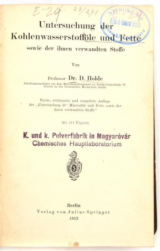 Dr. D(avid) Holde: Untersuchung der Kohlenwasserstofföle und Fette sowie der ihnen verwandten Stoffe. Berlin, 1913., Julius Springer, XVI+596+4 p.+ 3 (kihajtható táblák.) Szövegközti illusztrációkkal. Német nyelven. Átkötött félvászon-kötésben, egy-két foltos lappal, kopott borítóval, intézményi bélyegzővel, "K.u.K. Pulverfabrik in Magyarovár Chemisches Hauptlaboratorium" bélyegzéssel.