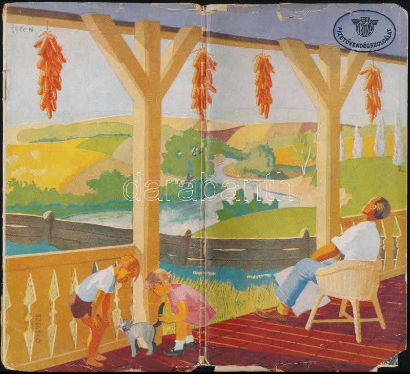 cca 1940-1950 IBUSZ FizetÅ‘vendéglátó szolgálató képes prospektusa. Bp., Athenaeum, 12 sztl. lev. Illusztrált (jelzett, Szecskó Tamás (1925-1987) grafikus) papÃrborÃtóval, a borÃtó sérült, szakadozott, hajtásnyommal.