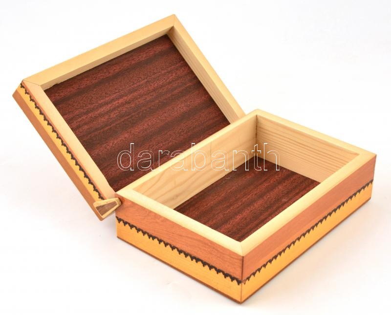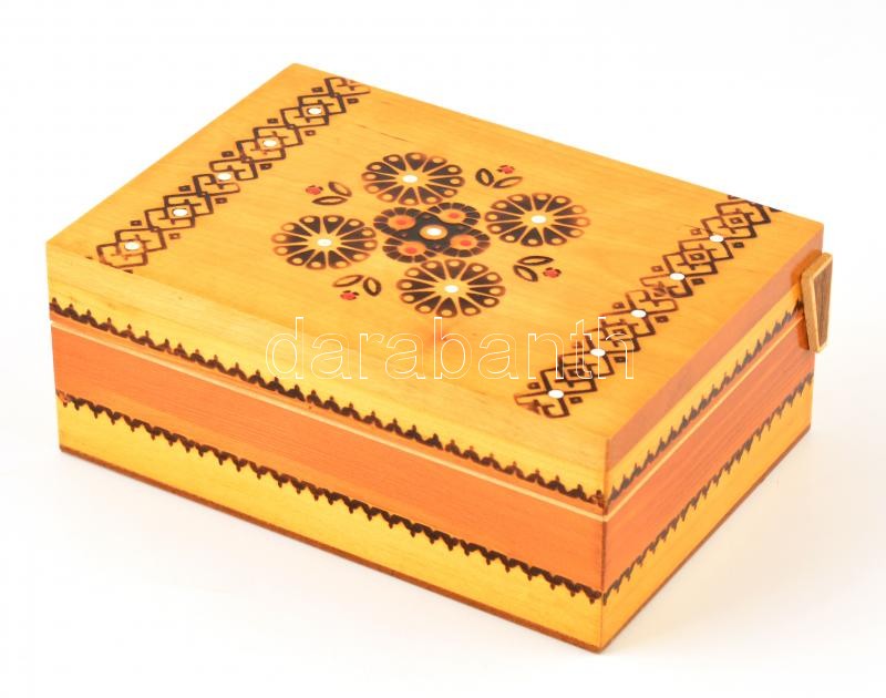 Leírás: Faragott, lakkozott, pirográf díszítésű fa ládika 20x14x7,8 cm