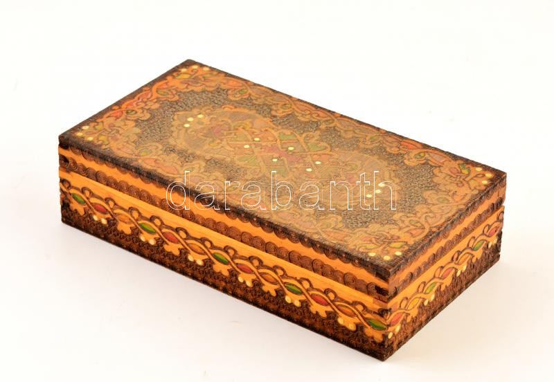 Leírás: Mintás fa doboz, kopott, 12×22×6 cm