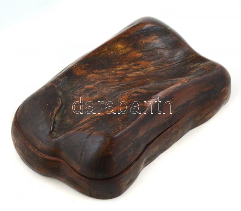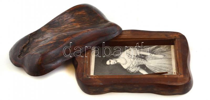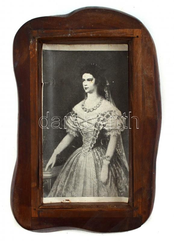cca 1900-1930 Faragott fa doboz laza fedéllel, benne Erzsébet királynét (Sisi, Sissi) ábrázoló nyomattal, mindkettő sérült, doboz mérete kb. 12,5x20x6 cm