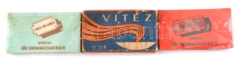 cca 1947-60 össz. 3 db használatlan, retró kis méretű teli borotvapenge papír doboz, különféle illusztrációkkal: 5 éves terv, bontatlan, fóliás csomagolásban. Szabadság szobor, bontatlan, fóliás csomagolásban és Vitéz, enyhén kopott.