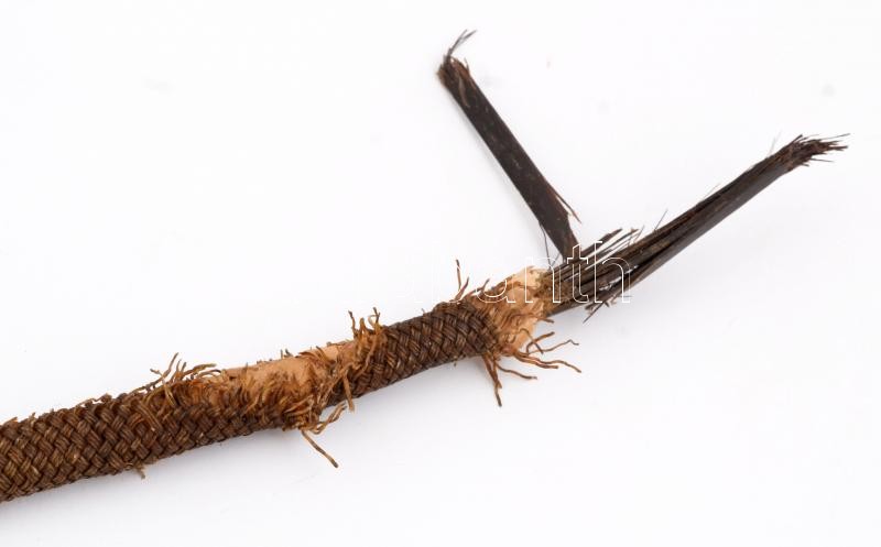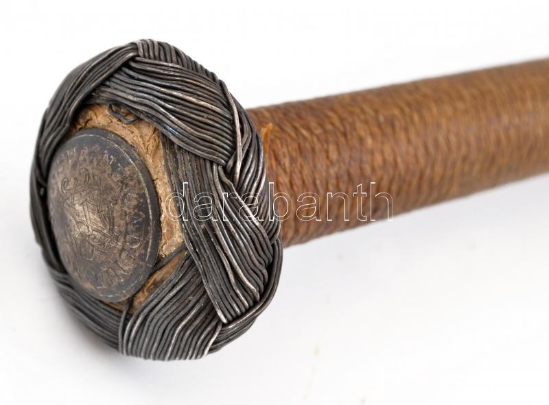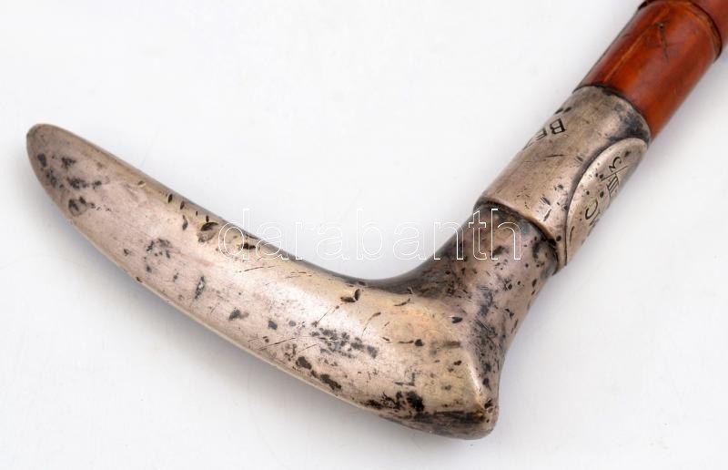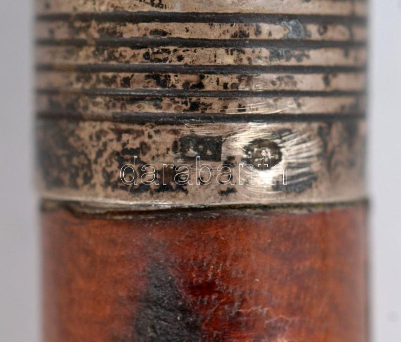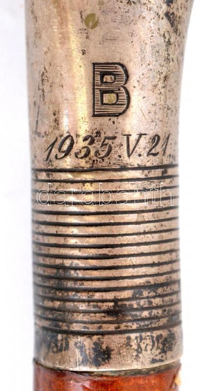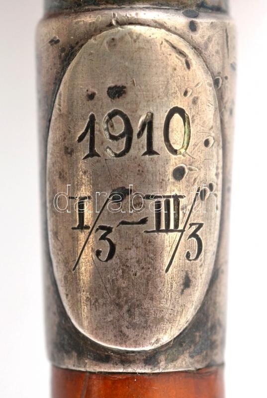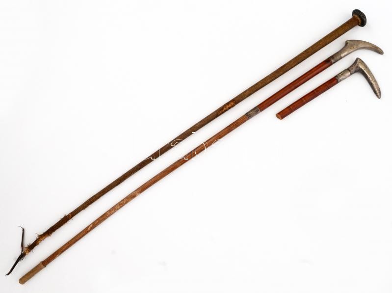 cca 1910-35 Lovaglópálca és kutyaostor tétel, össz. 3 db: 1 db nád, felső részé bőr borítással, ezüst (Ag) fejjel, jelzett, "B, 1935.V.21" gravírozással és bör borítás alatt ezüst (Ag), jelzett összekötő elemmel, , kopott, h: 81 cm. + 1 db fa, bőr borítással, ezüst (Ag) fejjel, jelzett, "1910 I./3-III/3, Bezsilla, Fonyó" gravírozással, sérült, kopott, a pálca alsó része hiányzik, h: 19 cm, + 1 db kutya ostor (vadászat során kutyáknak ezzel adtak jelzést), fonott, fém fejjel, tetején "London..." feliratú, gravírozott érem szerű díszítéssel, sérült, fonott rész több helyen szakadt, h: 82 cm