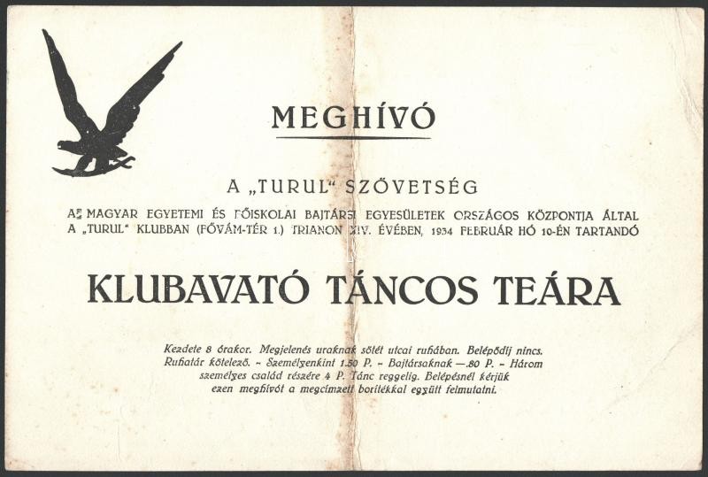 Leírás: 1934 Meghívó Turul szövetség klubavató teadélutánra. Hajtva 24x17 cm