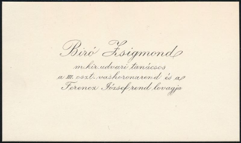 Leírás: Bíró Zsigmond, m. kir. udvari tanácsos, a III. oszt. vaskoronarend és a Ferencz József rend lovagja, névjegykártya