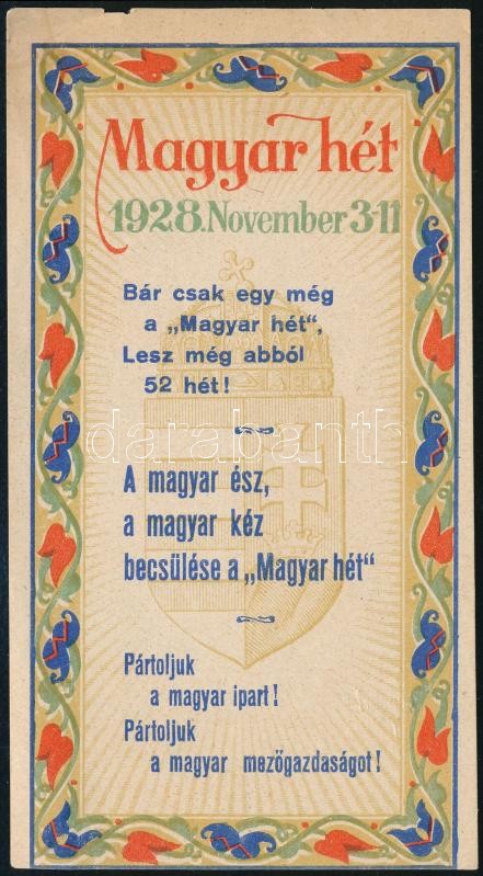 1928 Magyar hét, díszes számolócédula, enyhén sérült https://www.darabanth.com/hu/370-Gyorsarveres/370.0/Mutargy-papirregiseg-egyeb/Reklam~500026/1928-Magyar-het-diszes-szamolocedula-enyhen-serult~II2154893