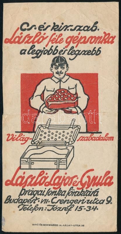 Cs. és kir. szab. László féle gépsonka...világszabadalom.. számolócédu... https://www.darabanth.com/hu/370-Gyorsarveres/370.0/Mutargy-papirregiseg-egyeb/Reklam~500026/Cs-es-kir-szab-Laszlo-fele-gepsonkavilagszabadalom-szamolocedula-Biro-es-Schwar~II2154047