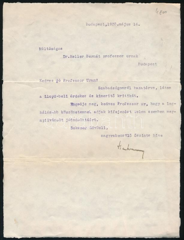 Leírás: 1935. Budapest, levél Dr. Heller Bernát professzor úrnak valószínűleg Hatvany Lajostól