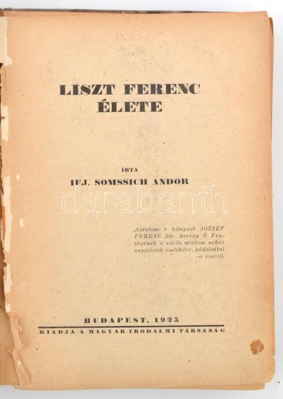 Ifj. Somssich Andor: Liszt Ferenc élete. Bp., 1925., Magyar Irodalmi T... https://www.darabanth.com/hu/370-Gyorsarveres/370.0/Mutargy-papirregiseg-egyeb/Zenetortenet-Kottak-Hangszerek~500028/Ifj-Somssich-Andor-Liszt-Ferenc-elete-Bp-1925-Magyar-Irodalmi-Tarsasag-Kopott-felvaszon~II2117051