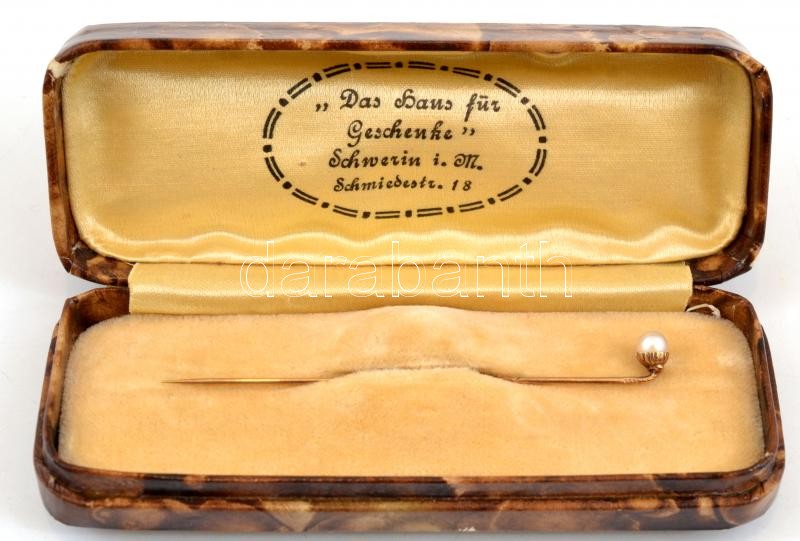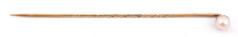 Leírás: Arany (Au) kalaptű igazgyöngy fejjel, jelzett, 8 karátos, tokban h: 6,5 cm, bruttó: 0,61 g