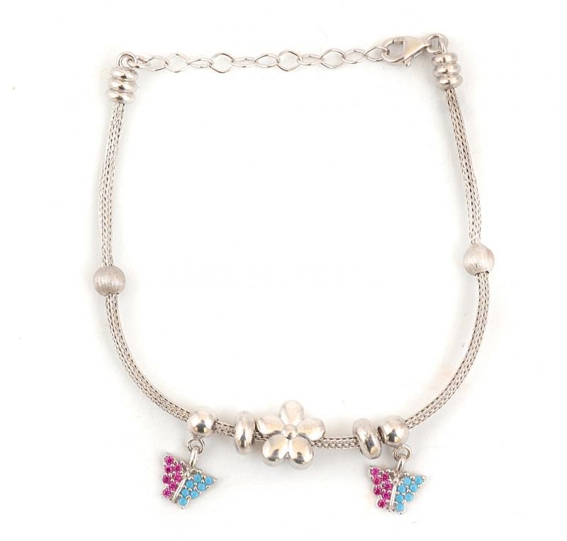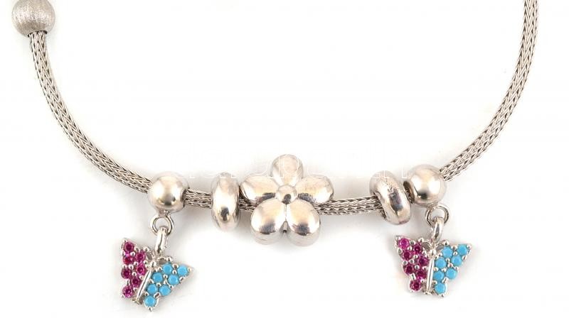 Leírás: Ezüst(Ag) karkötő, pillangós charmokkal, jelzés nélkül, állítható h: 20 cm, bruttó: 7,7 g