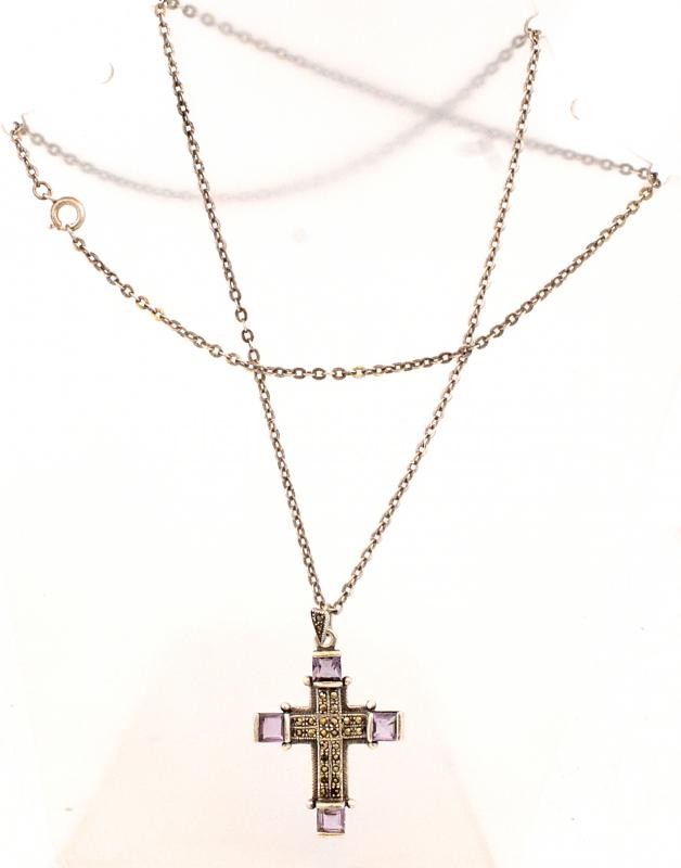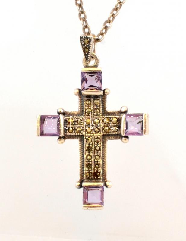 Leírás: Ezüst(Ag) lánc, ametiszttel és markazittal díszített kereszt medállal, jelzett, h: 63 cm, 4×3 cm, bruttó: 13,6 g