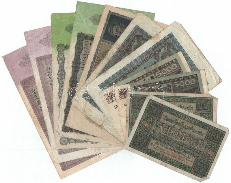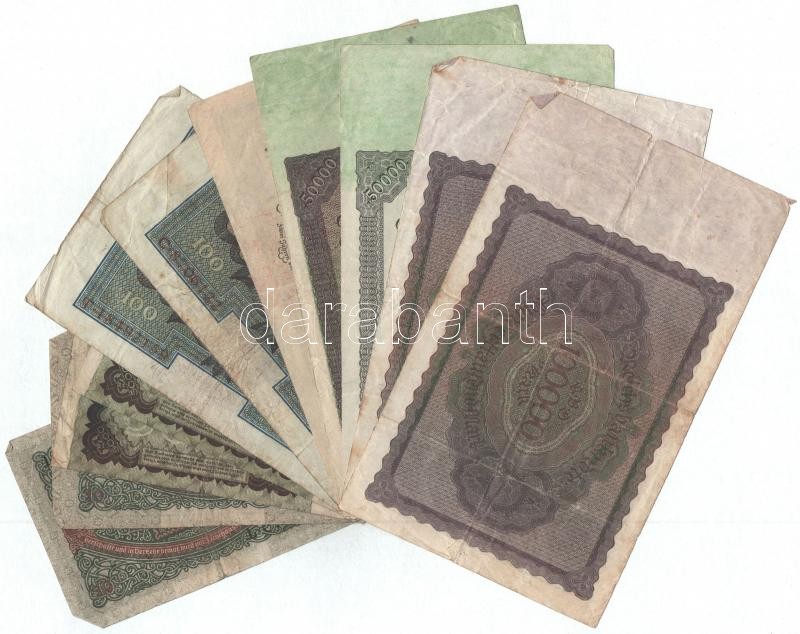 Németország / Weimari Köztársaság 1920. 10M (2x) + 100M (2x) + 1922. 5000M (2x) + 10.000M + 50.000M (2x, alapnyomattal és nélküle) + 1923. 100.000M (2x) T:III,III-