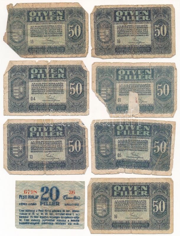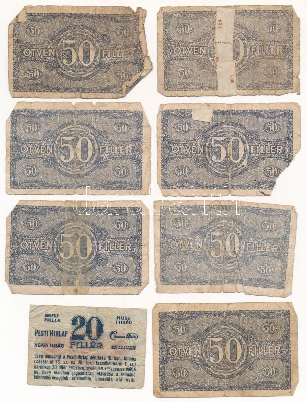 Leírás: 1920. 50f (7x) "01,04,05,13,16,18" sorozatjelekkel + ~1920. 20f "Pesti Hírlap" utalvány T:III-,IV ragasztott