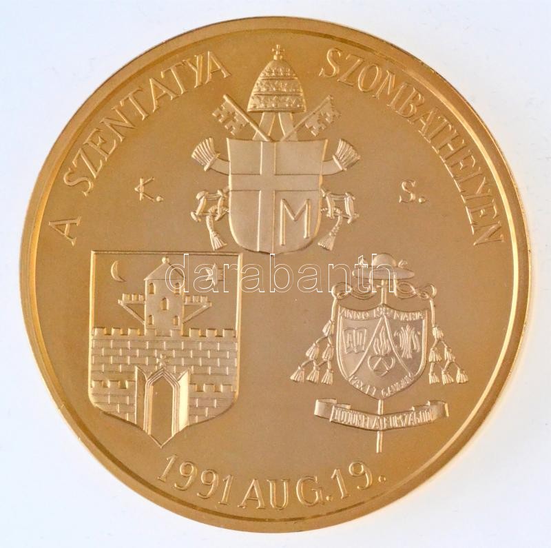 Leírás: Kiss Sándor (1925-1999) 1991. "II. János Pál pápa / A Szentatya Szombathelyen 1991. aug. 19." aranyozott Br emlékérem (65mm) T:PP felszíni karc
