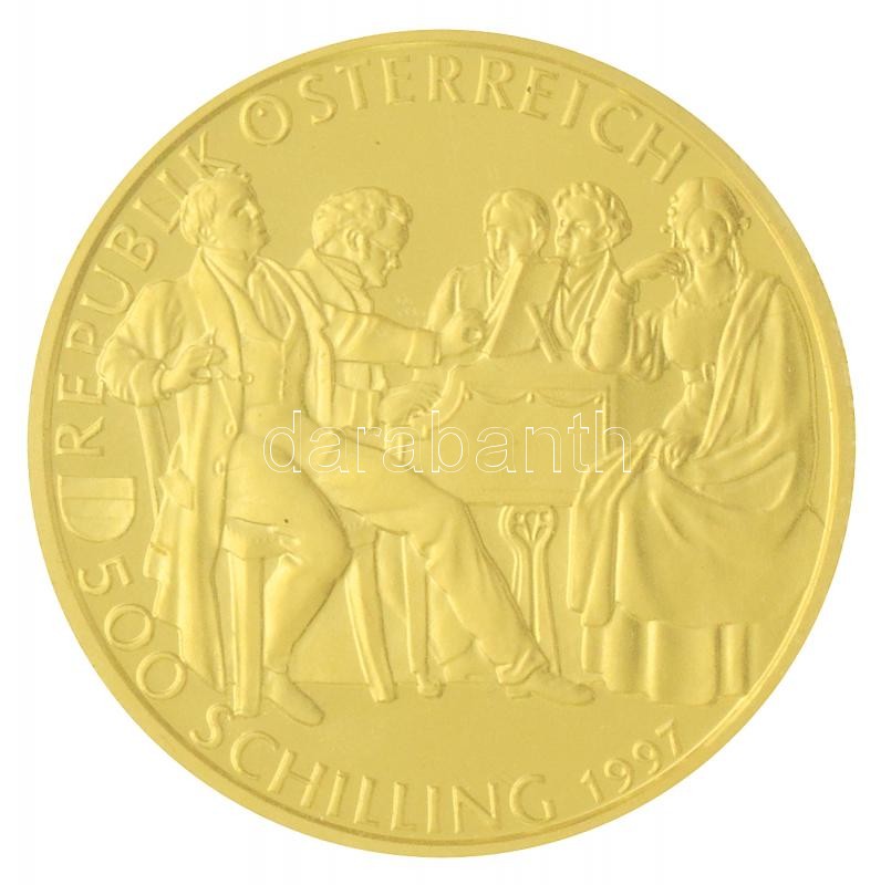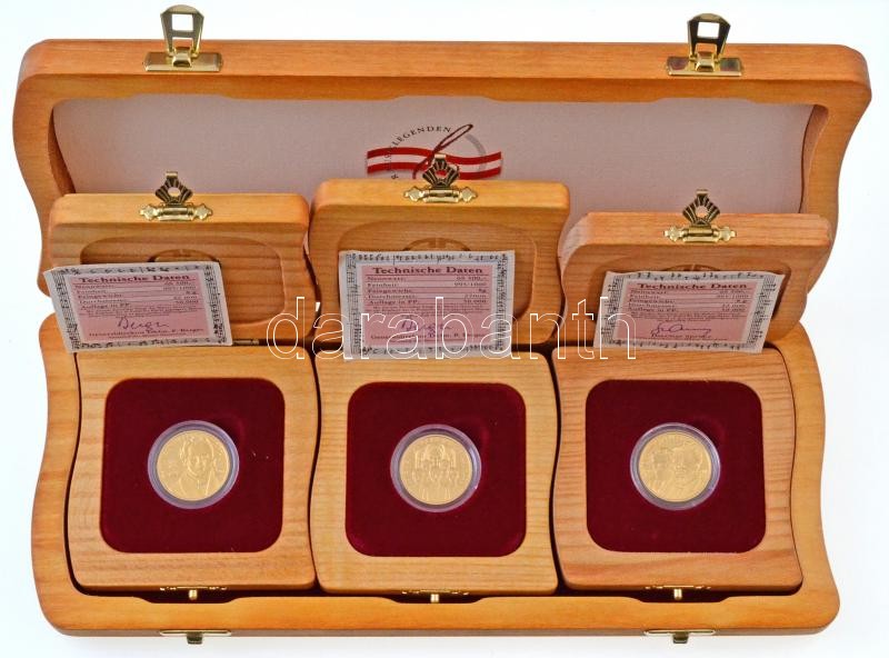 Ausztria 1997-1999. 500Sch Au (3xklf) szettben, "Franz Schubert", "Bécsi Fiúkórus", "Johann Strauss", mindegyik eredeti "Münze Österreich" fa tokban és tanúsítvánnyal, a 3db együtt közös "Wiener Musiklegenden" nagy fa tokban (8,16g,8,17g,8,09/0.995) T:PP ujjelnyomatos Austria 1997-1999. 500Sch Au (3xdiff) in set, "Franz Schubert", "Wiener Sängerknaben (Vienna Boys' Choir)", "Johann Strauss", all in "Münze Österreich" wooden case and with certificate, the 3pcs together in "Wiener Musiklegenden" big wooden case (8,16g,8,17g,8,09/0.995) C:PP fingerprints KM# 3040, KM# 3047, KM# 3055