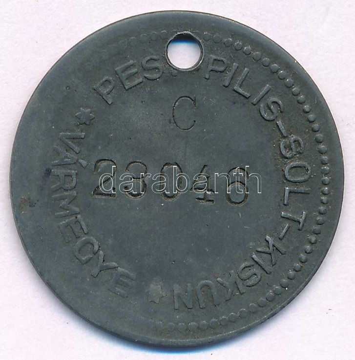 1941. "Pest-Pilis-Solt-Kiskun Vármegye" sorszámozott Zn kuty... https://www.darabanth.com/hu/370-Gyorsarveres/370.0/Numizmatika/Papir-es-fem-szuksegpenzek~2000025/1941-Pest-Pilis-Solt-Kiskun-Varmegye-sorszamozott-Zn-kutyabarca-T2-~II2154872