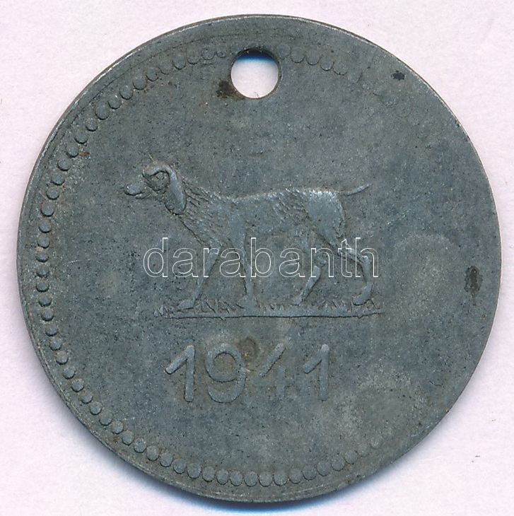 Leírás: 1941. "Pest-Pilis-Solt-Kiskun Vármegye" sorszámozott Zn kutyabárca T:2-