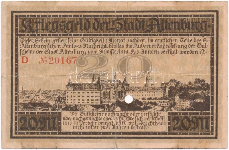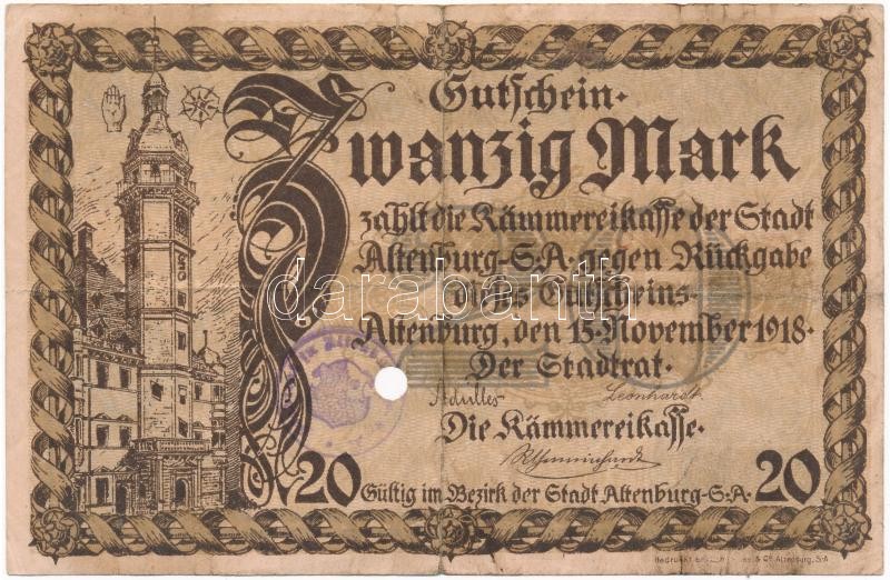 German Empire / Weimar Republic / Altenburg 1918. 20 Mark cancelled with hole C:VG tear