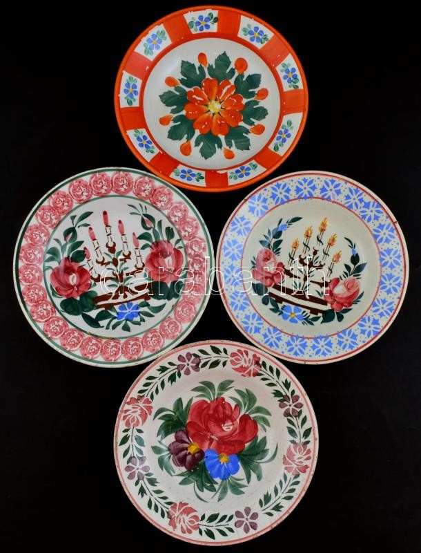 Leírás: 4 db nép mintás kerámia tál, kézzel festett, jelzett, kopásnyomokkal, lepattanásokkal, d: 23 cm