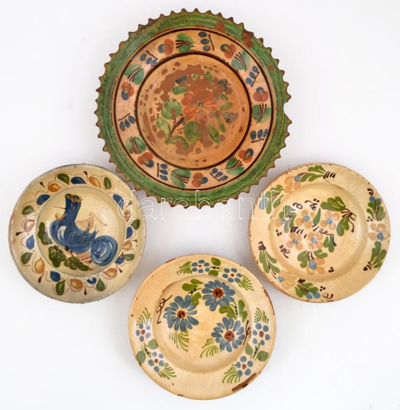 Leírás: XIX. sz. 4 db tányér. Mázas cserép, kézzel festett, kisebb hibákkal. d:20-28 cm