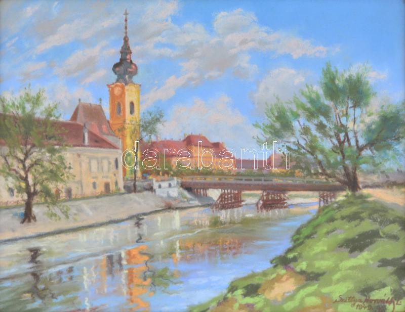 Szittya Horváth Lajos (1883-1960): Karmelita templom Győr, 1949. Pasztell, papír. jelzett, hátoldalán az alkotó tanácsadásaival pasztellfestmények gondozásáról és megőrzéséről. Üvegezett, díszes fa keretben, 25,5x35,5 cm
