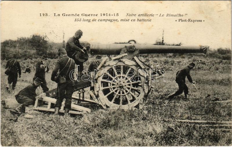 1915 Le Grande Guerre 1914-15. Notre artillerie "Le Rimailho" 155 long de campague, mise en batterie / WWI French military artillery battery, cannon. Phot-Express 123. (fl)
