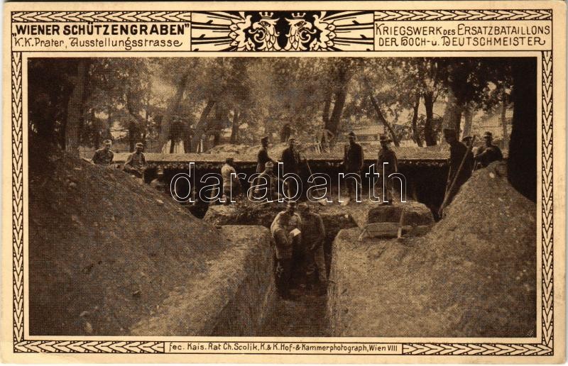Wiener Schützengraben. K.K. Prater, Ausstellungsstrasse. Kriegswerk des Ersatzbataillons der Hoch- u. Deutschmeister. Fec. Kais. Rat Ch. Scolik, K.u.K. Hof- & Kammerphotograph. Offizielle Karte vom Schützengraben des k.u.k. Kriegsfürsorgeamtes / WWI Austro-Hungarian K.u.K. military exhibition in Vienna, soldiers in the trenches (EK)