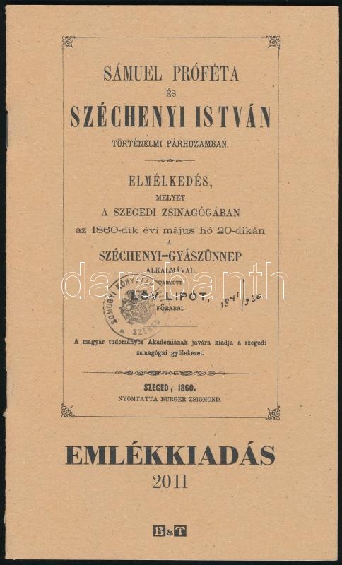 Löv Lipót: Sámuel próféta és Széchényi István történelmi párhuzamban. Elmélkedés, melyet a szegedi zsingagógában az 1860-dik évi május hó 20-dikán a Széchényi-gyászünnep alkalmával tartott Löv Lipót főrabbi. Szeged, 2011, Bába, 16+2 p. Emlékkiadás. Kiadói papírkötés.