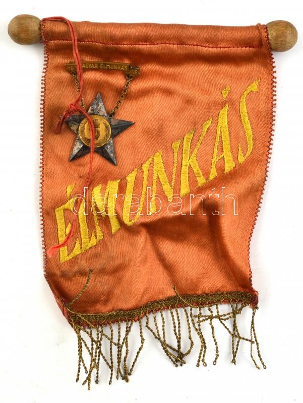 Leírás: 1948. "Magyar Élmunkás" fém kitüntetés, hátoldalon "1230" sorszámmal + selyem zászló
