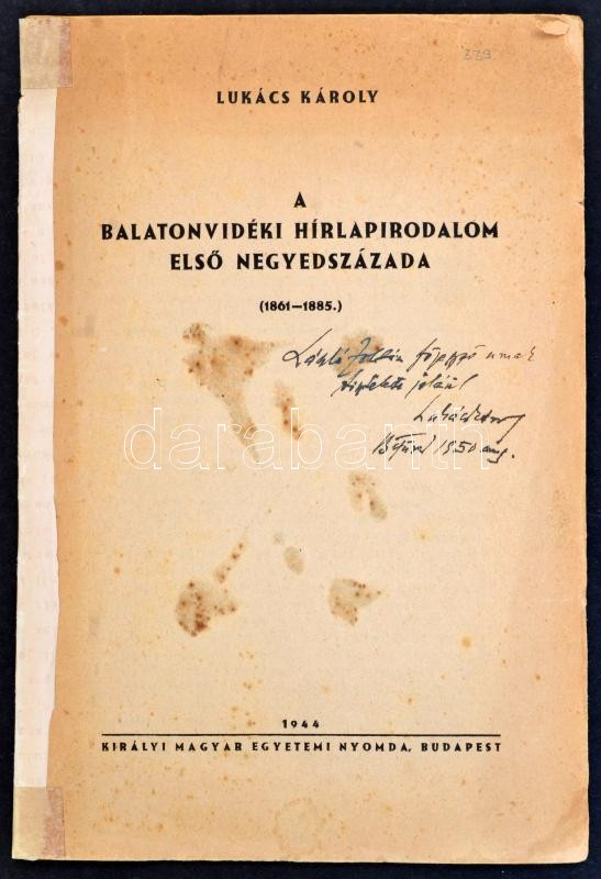 Lukácsy Károly: A balatonvidéki hírlapirodalom első negyedszázada. (1861-1885.) Különlenyomat. Bp., 1944., M. Kir. Magyar Egyetemi Nyomda, 20 p. Javított gerinccel, foltos címlappal, intézményi bélyegzővel. Dedikált!