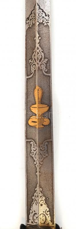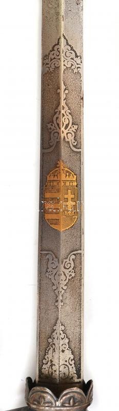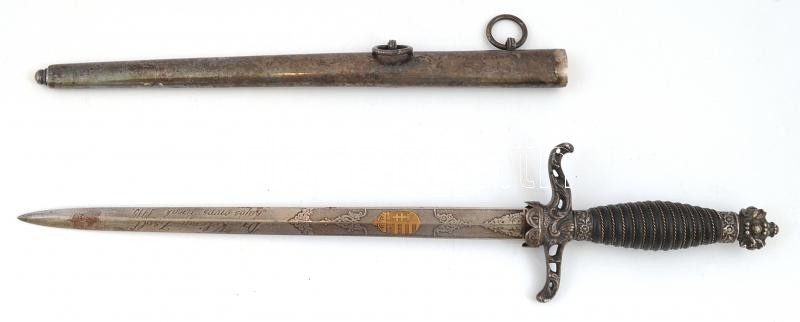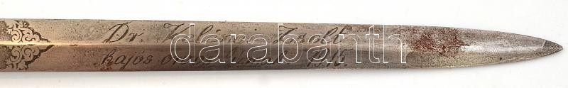 1915 Ezüstözött dísztőr, a penge egyik oldalán magyar címer díszítés, a másik oldalán Hügieia-kehely motívummal, a címeres oldalon gravírozás: "Dr. Kelényi Zsolt hajós orvos úrnak. 1915.", hüvellyel, h: 40,5 cm