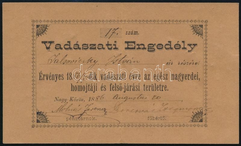 Leírás: 1886 Vadászengedély a nagyerdei, homojtáji és felső-járási területre
