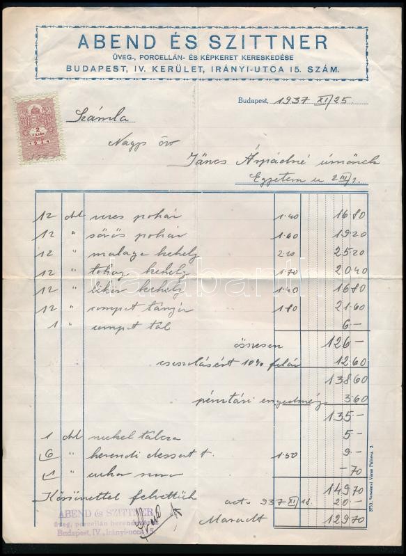 1937 Abend és Szittner üveg-, porcellán- és képkeret kereskedése, Bp., IV., Irányi-utca 15., fejléces számla 2 fillér okmánybélyeggel, többek közt herendi porcelán a tételek között, hajtásnyommal, apró szakadással
