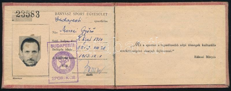 1953-54 Fényképes Bányász SE budapesti sportköre tagsági könyv (igazolvány), okmánybélyegekkel, vászon kötésben