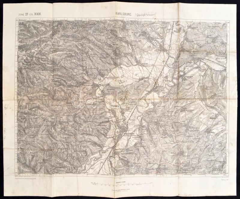 Leírás: 1890 Gyulafehérvár (Karlsburg) katonai térképe, kiadja: K. u. k. militärgeographisches Institut, 46,5×56,5 cm