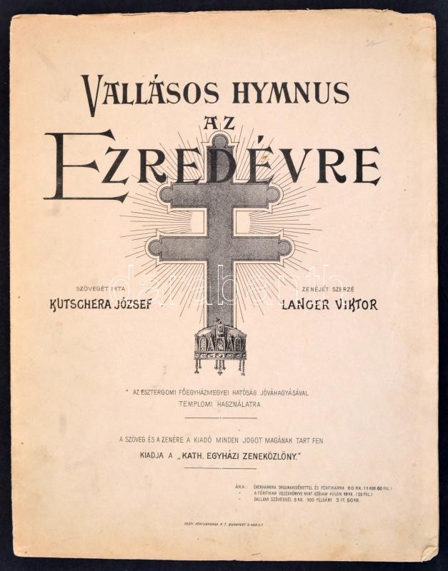 Leírás: cca 1900 Vallásos hymnus az ezredévre. Szövegét írta: Kutschera József, zenéjét szerezte: Langer Viktor. Kiadja a Pesti Könyvnyomda R.T. 4p.