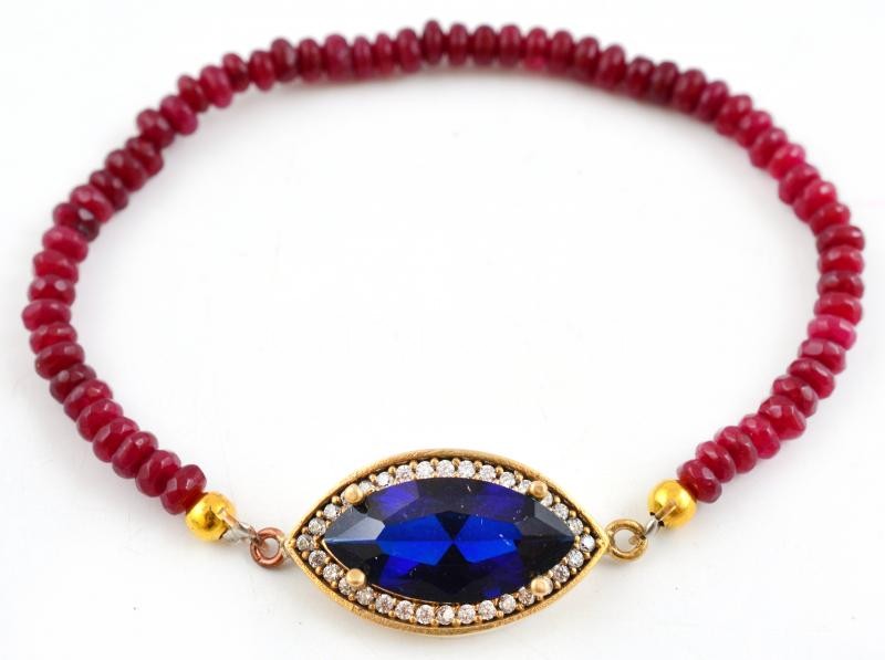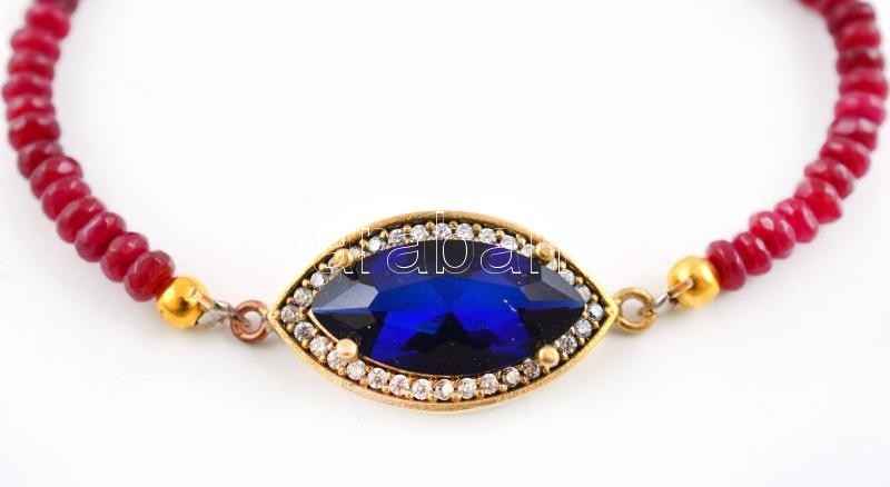 Leírás: Aranyozott ezüst(Ag) foglalatos féldrágakő, jelzett, gumírozott karkötő résszel, bruttó: 9 g