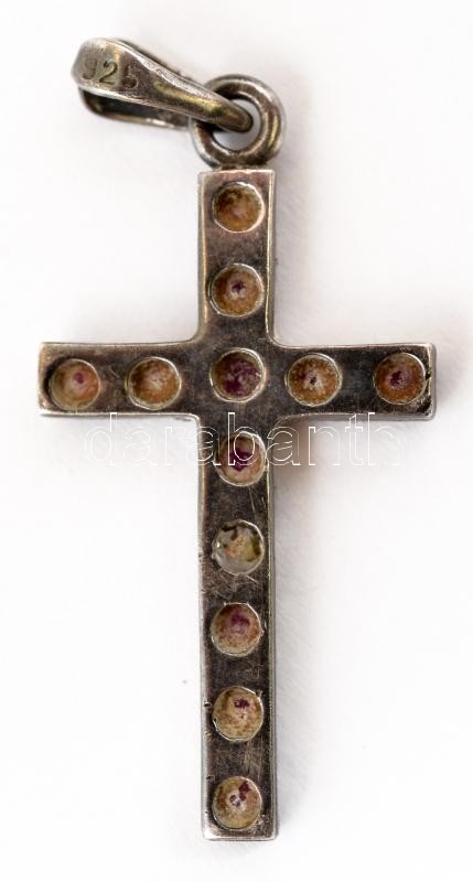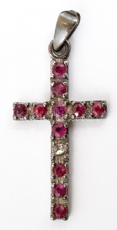 Leírás: Ezüst (Ag) sötét rózsaszín és fehér strasszokkal díszített kereszt alakú medál, jelzett, 4x1,5 cm, bruttó: 2,22 g