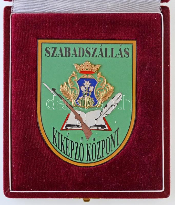 Leírás: ~1990. "Szabadszállás Kiképző Központ" festett fém plakett eredeti tokban (91x71mm) T:1