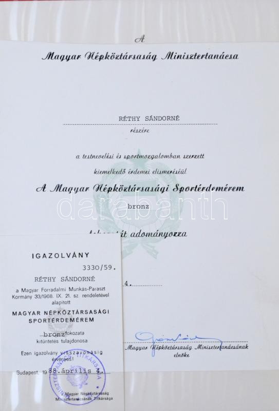 Leírás: 1988. "A Magyar Népköztársasági Sportérdemérem" bronz fokozatának adományozói okirata és viselői igazolványa Réthy Sándorné számára kiállítva