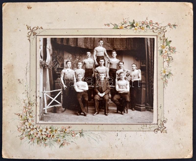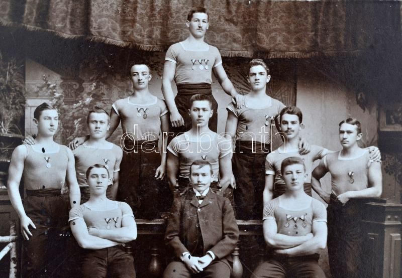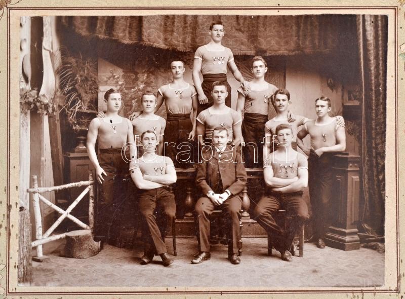 Leírás: cca 1900 Selmecbánya, sportolók kitüntetésekkel, kartonra kasírozott fotó, 12×15,5 cm