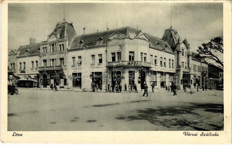 1942 Léva, Levice; Városi szálloda, üzletek / hotel, shops (EK) https://www.darabanth.com/hu/372-Gyorsarveres/372.0/Kepeslapok/Felvidek~2000007/1942-Leva-Levice-Varosi-szalloda-uzletek-hotel-shops-EK~II2171928