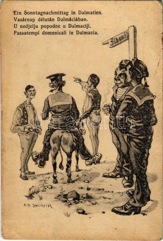 1918 Ein Sonntagnachmittag in Dalmatien / Vasárnap délután Dalmáciában / U nedjelju popodne u Dalmaciji / Passatempi domenicali in Dalmazia / K.u.K. Kriegsmarine Matrose / Austro-Hungarian Navy mariner humour art postcard, Sibenik. C. F. P. Nr. 8a. 1917/18. s: Ed. Dworak (EK)