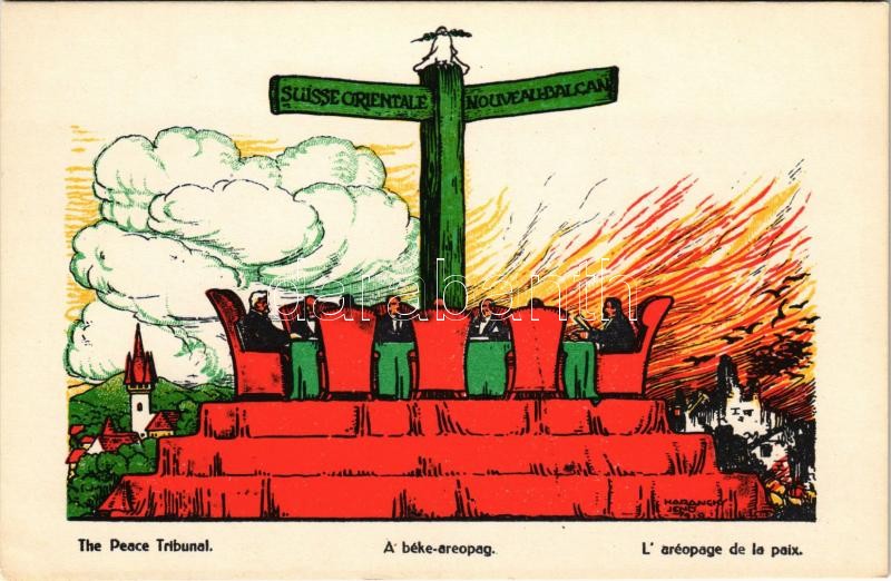 Suisse orientale, Nouveau Balcan / Magyarország feldarabolása Európa veszedelme. Béke-areopag / Peace tribunal, Hungarian irredenta art postcard s: Haranghy Jenő