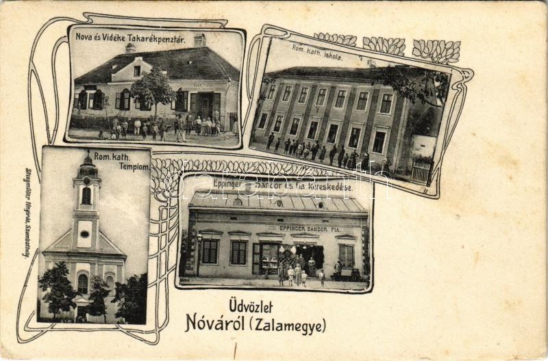 1908 Nova (Zala), Nova és Vidéke Takarékpénztár, Római katolikus iskola és templom, Eppinger Sándor és fia kereskedése és saját kiadása. Steegmüller fényirda, Art Nouveau, floral