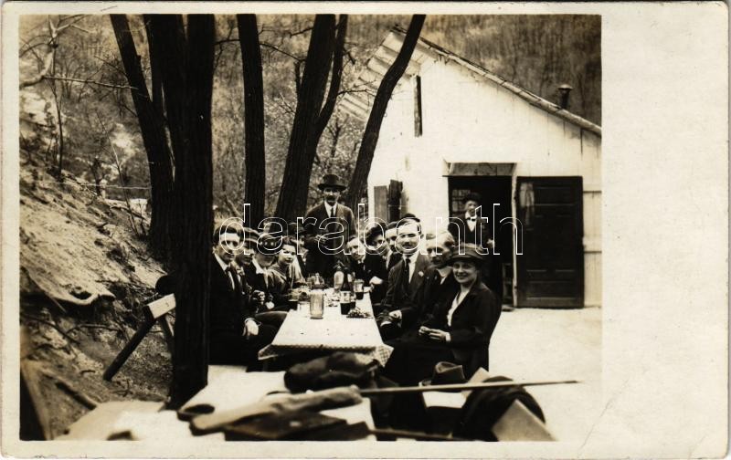 Leírás: 1918 Budapest XII. Zugliget, étterem kerthelyisége italozó társasággal. photo (EK)