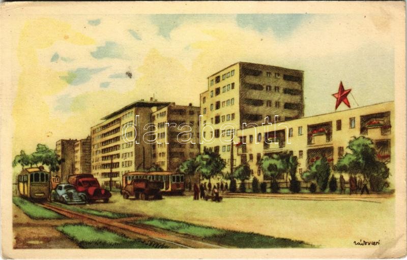 Leírás: Budapest XIII. Béke úti munkás lakóházak, villamos, automobil, teherautó. Képzőművészeti Alap Képcsarnoka s: Zádor István (EK)