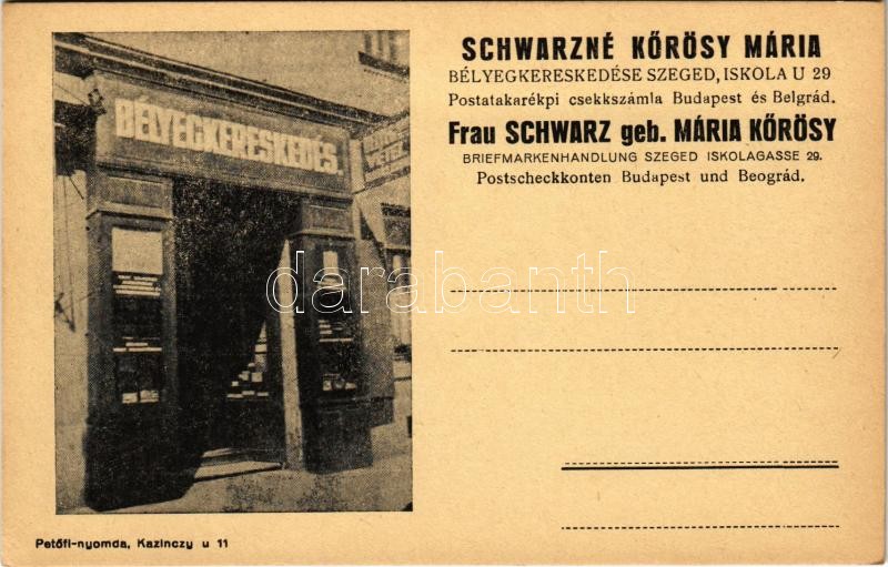 Leírás: Szeged, Schwarzné Kőrösy Mária bélyegkereskedése. Iskola utca 29. reklámlap / Briefmarkenhandlung