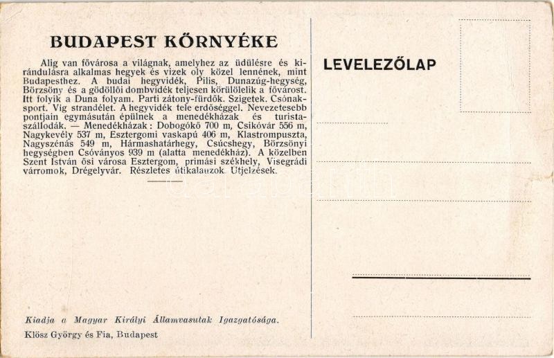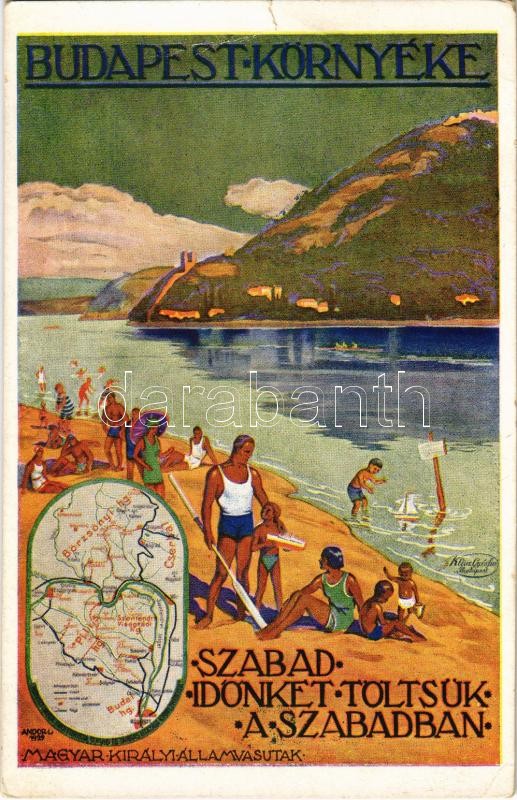 Visegrád és Nagymaros, Dunakanyar, Budapest környéke. MÁV (Magyar Királyi Államvasutak) turisztikai reklámlapja, strand fürdőzőkkel s: Andor L. (kis szakadás / small tear)